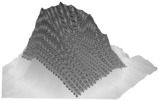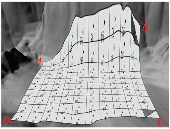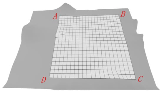 Phase 1: Digital surface modeling. To image a terrain surface with a sensor containing uniform resolution, a UAV adapts its position according to the terrain elevation. The nodes at which the UAV captures snapshots are treated as control points of a Bezier surface, from which the analytical parameters of the surface are subsequently derived. Figure 8 shows a closed surface to be observed. Global Mapper software (V14.0) comes with a terrain gridding tool that imports the terrain DEM data and allows grid elements with the longitude, latitude, and altitude information of each grid point to be exported. To determine the UAV’s flight altitude and sampling positions, the normal vectors of each grid area must be calculated, and then a point along the normal vector with a fixed height offset from the grid center is used as the UAV’s observation point.