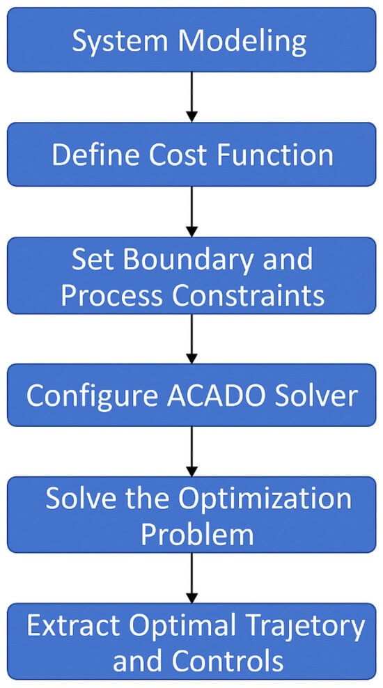 Consequently, the optimal control strategy and the corresponding energy cost for each path segment are computed. To clarify the optimization process implemented in this phase, we present a schematic flowchart in Figure 9, which outlines the core steps of the ACADO-based energy minimization procedure. This includes system modeling, cost function specification, constraint setting, and solver execution, all aligned with the UAV’s dynamic characteristics.