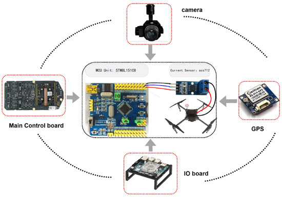 The static power mainly consists of consumption from the flight control board and sensing devices such as the camera and ultrasonic radar. For accurate measurement, we designed a SCM (Single Chip Microcomputer) system (STM8L151C8) equipped with a current sampling module. Therefore, the static power was acquired by setting the UAV to a standby state. Our hardware acquisition system was as follows.