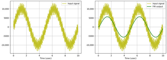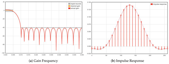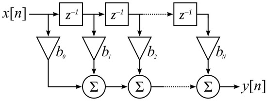 Filters are generally used in electronic circuits for various purposes such as filtering noise and unwanted signals, separating certain frequencies, and limiting signals before sampling. A digital filter is a method or algorithm that works on digitized analog signals, converting the input signal to the desired output signal. The main design purposes of the filters, which have very wide application areas, are to separate the interfered signals from each other, to increase the signal quality by reducing the noise in the signal, and to recover the distorted signal. Digital signal processing involves performing the desired operations on the frequency spectrum of a signal to provide the desired result after these operations. This digital signal processing structure is called a digital filter. Digital filters can be implemented with either software or hardware. Digital filters are divided into two categories according to their impulse responses. These are finite pulse response and IIR filters [32,33]. The Parks–McClellan algorithm is an iterative approach to explore the ideal Chebyshev FIR filter. It is used to design and apply effective FIR filters. An indirect method is used to find the optimal filter coefficients [34]. The input and output relation of the FIR filter given above can be given as in Equation (1);