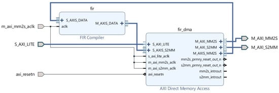 FIR filters are mathematically fast and relatively easier to design and implement digitally. The determined coefficients are added to the FIR filter software. A hardware filter is designed on the FPGA, with a software filter running on the CPU and GPU. The FIR compiler module was added to the block diagram on the Xilinx Vivado HLS program, and the t-filter coefficients and FIR filter settings were added to the module. The advanced extensible interface (AXI) communication protocol, one of the most important features of Xilinx FPGAs, provides data communication between the ARM CPU and FPGA on the PYNQ Z1. AXI direct memory access module has been added to the FIR compiler module as shown in Figure 4. This module provides a detailed analysis of the integration and functionality of the FIR compiler and the AXI direct memory access module within an FPGA-based system. The FIR compiler is employed for efficient digital filtering, while the AXI direct memory access module facilitates high-speed data transfer between memory and processing units. Their combined use enhances the performance of real-time applications by leveraging hardware acceleration and optimized data handling.