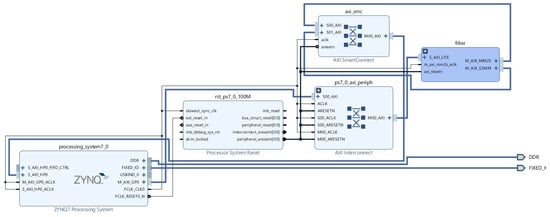 The FIR compiler and AXI DMA modules are combined into a single, unified module identified by a specific filter name, streamlining signal processing tasks and enhancing system efficiency by integrating filter design and high-speed data transfer capabilities. The designed filter module is combined with the ZYNQ processing system module and AXI modules in order to communicate with the processor on the PYNQ board and to work with Python codes, as shown in Figure 5. Thus, the output signal results were examined by sending the input signal to the hardware filter designed on the FPGA using the Linux operating system and Jupyter Notebook (https://jupyter.org/) that we installed on PYNQ board. The following figure shows the block diagram of the FIR filter designed on the FPGA with the VIVADO HLX program, the ZYNQ operating system, and the hardware that performs bitstream communication between these two systems.