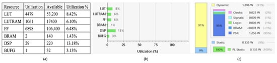 (a) FPGA resource usage report. This report provides a comprehensive analysis of resource utilization for an FPGA implementation. (b) Resource usage graph. This graph presents a detailed analysis of the FPGA resource usage graph, illustrating the distribution of key hardware resources across the design. (c) FPGA power consumption graph. The logic module for the FIR filter consumes a total of 135 mW energy. The SoC Arm processor part on the PYNQ Z1 board consumes 1.296 W of energy.