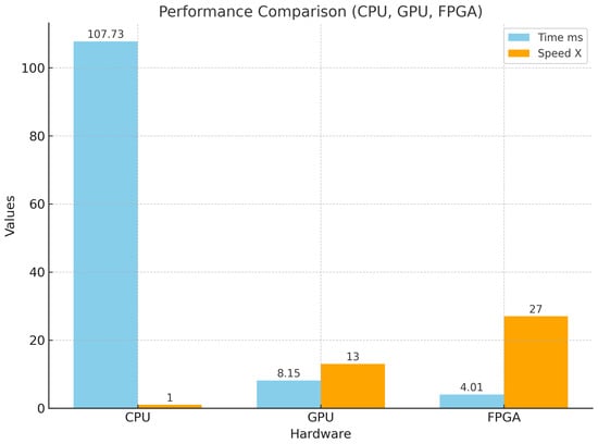 While the software-based filtering process was performed using the CPU in 0.107 s, it was completed on the GPU in 0.008 s. The hardware-based filtering process on the FPGA was completed in just 0.004 s. These results indicate that the FPGA implementation is approximately 27 times faster than the CPU, while the GPU implementation is about 13 times faster than the CPU. Unlike CPUs, GPUs contain thousands of processing cores, allowing for true parallelism in computational tasks such as image processing or cryptocurrency mining. The architecture of FPGAs, however, is fundamentally different. Instead of relying on programmable cores or kernels, FPGAs implement parallelism at the hardware level through configurable logic blocks and interconnects. These logic blocks can be programmed to operate concurrently, enabling task-specific parallel data processing. While CPUs offer flexibility and are capable of executing a wide range of software with varying levels of complexity, GPU programming often requires adherence to architectural constraints and memory access patterns. In contrast, FPGA design involves creating dedicated digital circuits that can operate in parallel or series, depending on the application’s requirements. These circuits are not software functions, but rather physical hardware connections configured to perform specific operations. As a result, the performance comparison outcomes of the filtering process are illustrated in Figure 8.