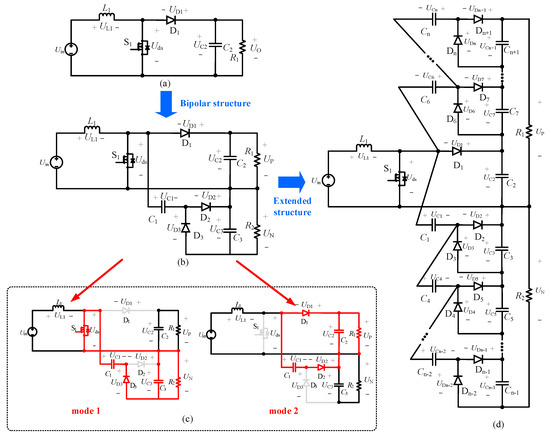 The traditional Boost converter, as shown in Figure 1a, features a continuous input current and a simple structure that has been widely applied. However, its unipolar output is unsuitable for bipolar DC microgrids. To construct a bipolar configuration, this work incorporates a negative branch composed of capacitors and diodes into the traditional Boost circuit, as depicted in Figure 1b. In this bipolar topology, the positive output port is implemented by the Boost converter with a voltage of UP, and the negative output port is implemented by the negative branch with a voltage of UN. In the proposed topology, when diode D3 is turned on, the intermediate capacitor C1 is connected in parallel with the negative output port, and the voltage at the negative output port is the voltage of the intermediate capacitor C1, as shown in mode 1 of Figure 1c. When diodes D1 and D2 are turned on, the intermediate capacitor C1 is connected in parallel with the positive output port. At this time, the voltage at the positive output port is the voltage of the intermediate capacitor C1, as shown in mode 2 of Figure 1c. Therefore, through the alternating operation of the diodes, the intermediate capacitor is alternately connected in parallel with the output ports. By using the property that the capacitor voltage cannot change abruptly, the output port voltages are kept the same, so as to realize the self-balancing of the output voltage without additional control mechanisms, and the method that realizes the inter-pole voltage balance only by the topology without using the voltage balance control method is defined as voltage self-balancing. Considering that conventional Boost converters exhibit limited voltage gain and fail to meet the high gain demands in renewable energy applications, this work also extends the structure in Figure 1b by integrating expansion branches to both the positive and negative branches, as shown in Figure 1d. This enhancement effectively increases output voltage while maintaining the simple control and driving methods, since there are no active switches in the expansion modules. The expansion modules allow flexible configuration to meet specific voltage gain requirements and alleviate device stress according to engineering needs.