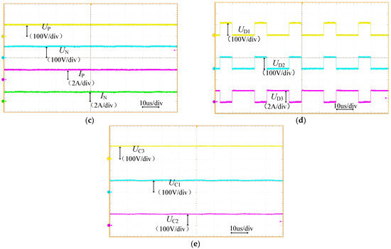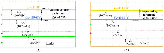 The experimental waveforms are illustrated in Figure 7. As revealed by the experimental results, when the output power deviation is 200 W, the voltage deviation reaches 1.79 V with a VUF% of 0.8%. When the output power deviation reduces to 100 W, the corresponding values of voltage deviation (1.48 V) and the VUF% (0.67%) are observed. These findings effectively validate that the proposed converter exhibits outstanding self-balancing characteristics.