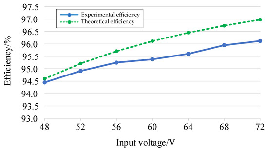 The experimental and theoretical efficiency curves of the proposed converter under varying input voltages are depicted in Figure 9. The experimental prototype achieves a rated experimental efficiency and maximum experimental efficiency, both reaching 96.12% under the rated operating conditions.