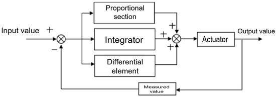 PID control, namely, proportional, integral, and derivative control, is a control algorithm commonly used in industrial systems. It has the advantages of simple principles, an easy adjustment, and a wide application range, and it can quickly and accurately correct the negative feedback system. Therefore, the PID module is designed in the energy braking recovery system to better regulate the speed of the system. PID control can increase the precision of the control by adjusting the coefficients of the three links—ratio (P), integral (I), and differential (D)—in which the proportion link affects the response speed of the system to the error, and the integration link is responsible for eliminating the static error of the system; The differential link can be adjusted in advance to ensure the stability of the system [18,19]. The PID control principal diagram is shown in Figure 1.