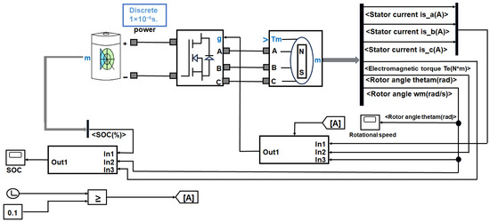 The main structure of the main module includes the battery, the inverter bridge, and the motor. The DC output of the battery is converted to the AC output of the driving motor through the inverter bridge. After the motor is started, the speed, torque, and phase current will be output to the control module and recovery module to ensure its normal operation [21,22]. The specific structure is shown in Figure 2.