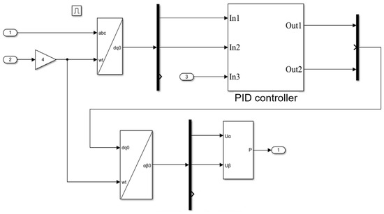The control module is based on the PID control method introduced in the previous section to control the motor. The input value of this module is the three-phase current of the motor, the angle of the motor, and the speed of the motor, and the output value is the PWM signal to stabilise the speed of the motor at the target value [24,25]. The specific structure is shown in Figure 3. The inputs 1, 2, and 3 in Figure 3 correspond to In1, In2, and In3 in Figure 2, which represent the system control signals. The desired value is set within the PID control block itself. The block’s inputs include the current motor speed and the transformed current obtained through the system, while the output is the adjusted current after PID control. The Gain Block 4 is used to convert the input motor angle for further processing in the control system. In the current simulation model, a delay module has been implemented, with the motor starting at t = 0.1 s.