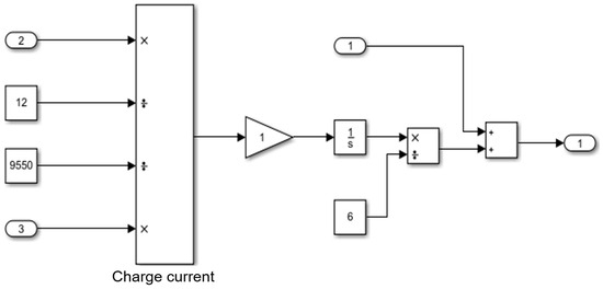 The battery model used in this simulation model can directly output the real-time SOC value of the battery, which can correct the measurement deviation generated in the process of using the ampere–hour integration method, so as to eliminate the error in time and ensure the SOC estimation accuracy. Based on this, the recovery module adopts the ampere–hour integration method as the SOC estimation method and designs two parts: the charging current calculation and SOC estimation. The specific structure is shown in Figure 4.