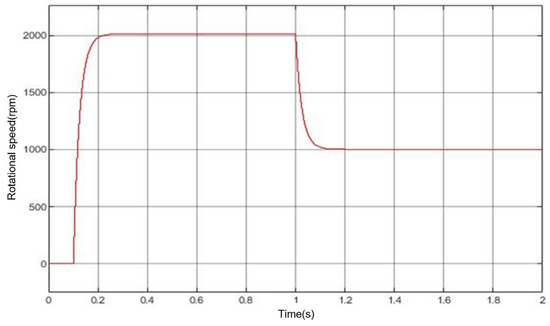 After starting the motor and adjusting the control module, the motor speed is stabilised at 2000 rpm. Then, when t = 1 s, the braking signal comes, the model enters the braking state, and the motor speed drops to 1000 rpm. The change in motor speed in the simulation process is shown in Figure 5. As can be seen from the figure, the simulation model has a good ability to regulate the speed of the motor so that it can reach the target speed in a short time and maintain stability at the target speed.