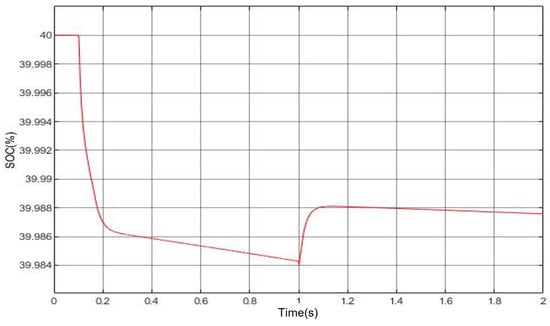 After the initial SOC value of the battery and the speed and torque of the motor are input, the recovery module starts to run, and its changes in the simulation process are shown in Figure 8. As can be seen from the figure, when the motor is not started, the battery SOC remains 40% unchanged; when the motor starts to accelerate to the rated speed, the SOC also begins to decrease rapidly until the motor speed stabilises at the rated speed, at which time the SOC slowly decreases to maintain the speed.