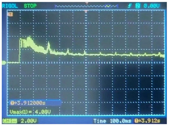 The simulation model development has currently reached the no-load stage. However, practical tests were conducted to characterise the actual charge/discharge behavior during motor operation. For the studied motorcycle battery system, the charger delivers a 0.1 C charging current during stationary charging. Manufacturer specifications dictate the operational limits of a ≤90 A discharge current during motor acceleration and a ≤20 A charging current during regenerative braking. Experimental measurements of the starting current shown in Figure 9 were acquired using a current probe with 5 mV/A sensitivity and oscilloscope 10× magnification, establishing a 1 V-to-20 A conversion ratio. The recorded peak starting current of 81.6 A confirms the compliance with the discharge current requirement, while separate tests verified that regenerative charging currents remained within the 20 A threshold.
