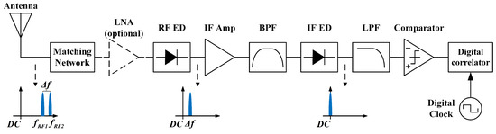 Notably, as shown in (1), the ED inherently discards frequency information, eliminating the need for precise IF frequency control—the core principle of uncertain-IF architectures [20,33]. Replacing PLLs with voltage-controlled oscillators (VCOs) reduces power consumption at the cost of wider IF bandwidths and elevated intermediate-frequency noise. This design compromise makes uncertain-IF systems suitable for applications requiring sensitivity marginally beyond the limits of RF envelope detection architectures.