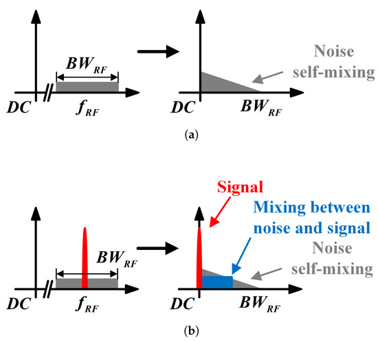 Power spectrum density versus frequency for (a) noise self-mixing and (b) mixing between noise and signal.