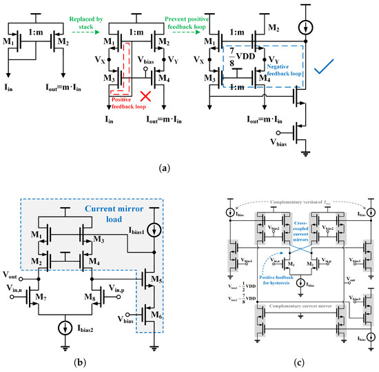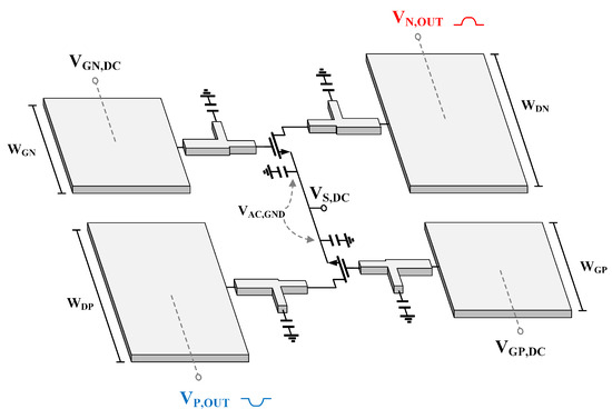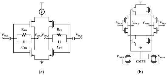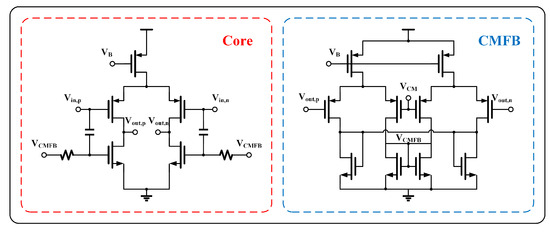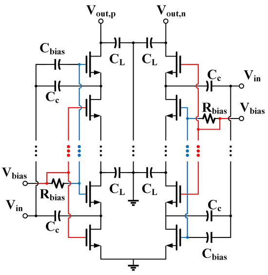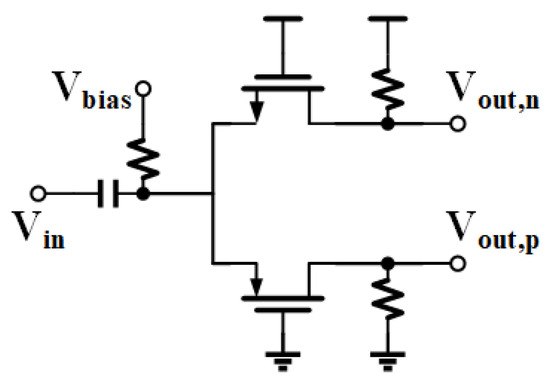 Similar to passive architectures, active EDs can utilize current-reuse pseudo-differential structures as shown in Figure 9. Operating in the subthreshold region, this design maintains sufficient voltage headroom even under a 0.5 V supply. However, inherent mismatches between PMOS/NMOS transistors and load variations lead to output voltage asymmetry.