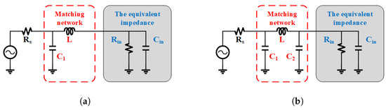 Figure 10 illustrates typical L- and -type matching networks used in RF envelope detection WuRX architectures. The parameter represents the equivalent input capacitance of the WuRX, including contributions from bond pads, package, PCB, etc. Similarly, denotes the equivalent input resistance of the WuRX.