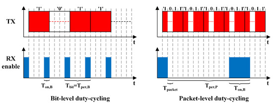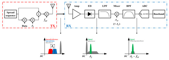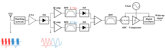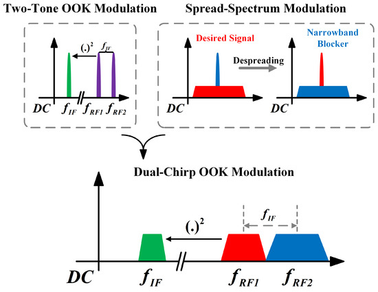 Further optimization of two-tone signals, via channel-embedded on–off keying (CE-OOK) or spread spectrum techniques, can improve sensitivity and noise immunity. CE-OOK technique modulates the RF carrier using OOK by a BFSK-pre-modulated IF signal. CE-OOK is more compatible with communication protocols, while also improving the sensitivity and interference injection of the receiver, but it also increases the complexity of the receiver [20,22]. Spread spectrum technique modulates the RF carrier using a pseudo-random sequence, which can improve the robustness of the receiver against interference, but it also reduces compatibility [24,36,37].