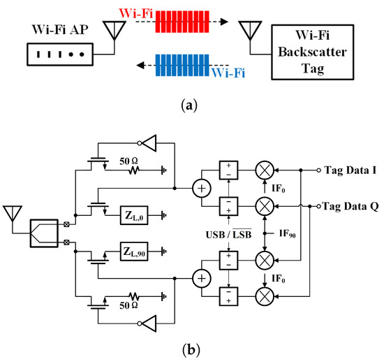 - Wang, P.H.P.; Zhang, C.; Yang, H.; Dunna, M.; Bharadia, D.; Mercier, P.P. A Low-Power Backscatter Modulation System Communicating Across Tens of Meters with Standards-Compliant Wi-Fi Transceivers. IEEE J. Solid-State Circuits 2020, 55, 2959–2969. [Google Scholar] [CrossRef]