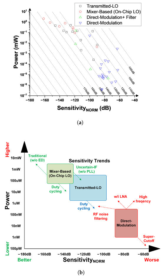 (a) Power versus normalized sensitivity with normalized FoM. (b) Sensitivity trends across different architectures.