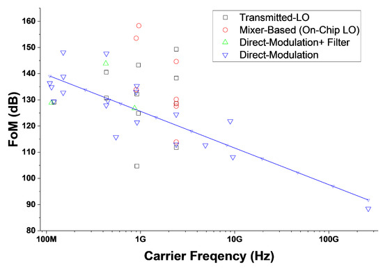 Another key factor influencing WuRX performance is the choice of RF carrier frequency. Figure 33 shows the relationship between the reported FoM and carrier frequency across previously published WuRX designs. For RF envelope detection architectures, a clear downward trend in FoM with increasing frequency can be observed. This is largely attributed to the degradation of passive gain at higher frequencies [12,51,56]. For the other two categories, the number of reported designs is limited, and most operate within narrow frequency ranges—primarily within the ISM and 2.4 GHz bands. Although FoM also tends to decrease with increasing frequency, the variation is relatively small.