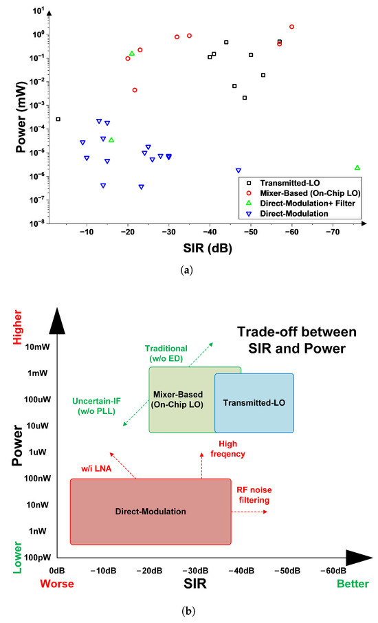 Figure 35 highlights the trade-off between SIR and power consumption across different WuRX architectures. Direct-modulation designs generally achieve the lowest power, often in the nanowatt range, but suffer from limited SIR performance, typically worse than −30 dB. The addition of an LNA not only increases power dissipation but can also degrade the SIR. On-chip LO architectures occupy an intermediate position, consuming higher power in the microwatt to milliwatt range but achieving significantly better interference rejection. Transmitted-LO architectures eliminate the need for an on-chip LO and can thus achieve superior SIR at comparable power levels, while requiring higher complexity and power consumption on the transmitter side. Overall, the figure highlights that achieving strong interference rejection typically requires higher power budgets, and that different architectural choices reflect distinct compromises between robustness and energy efficiency.