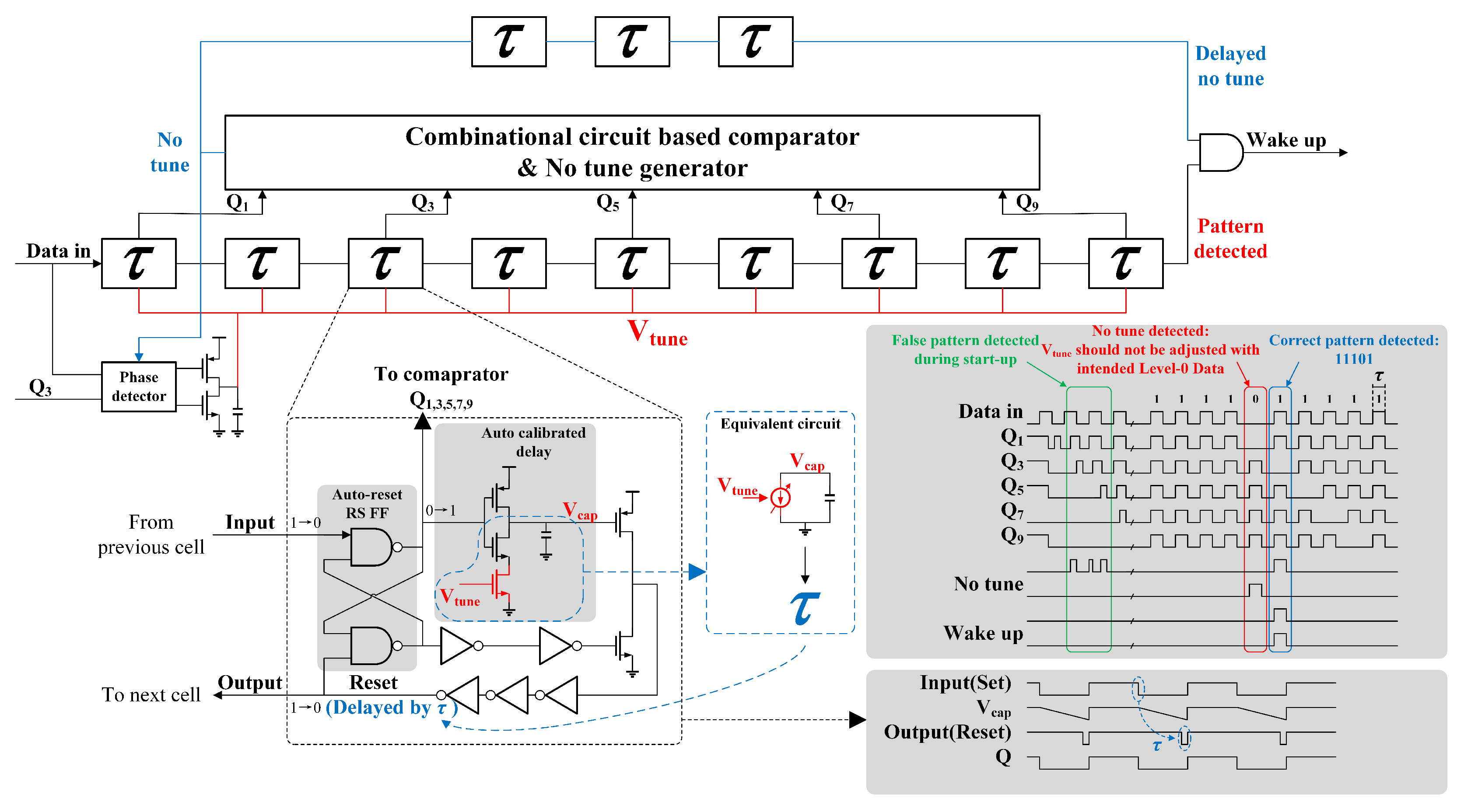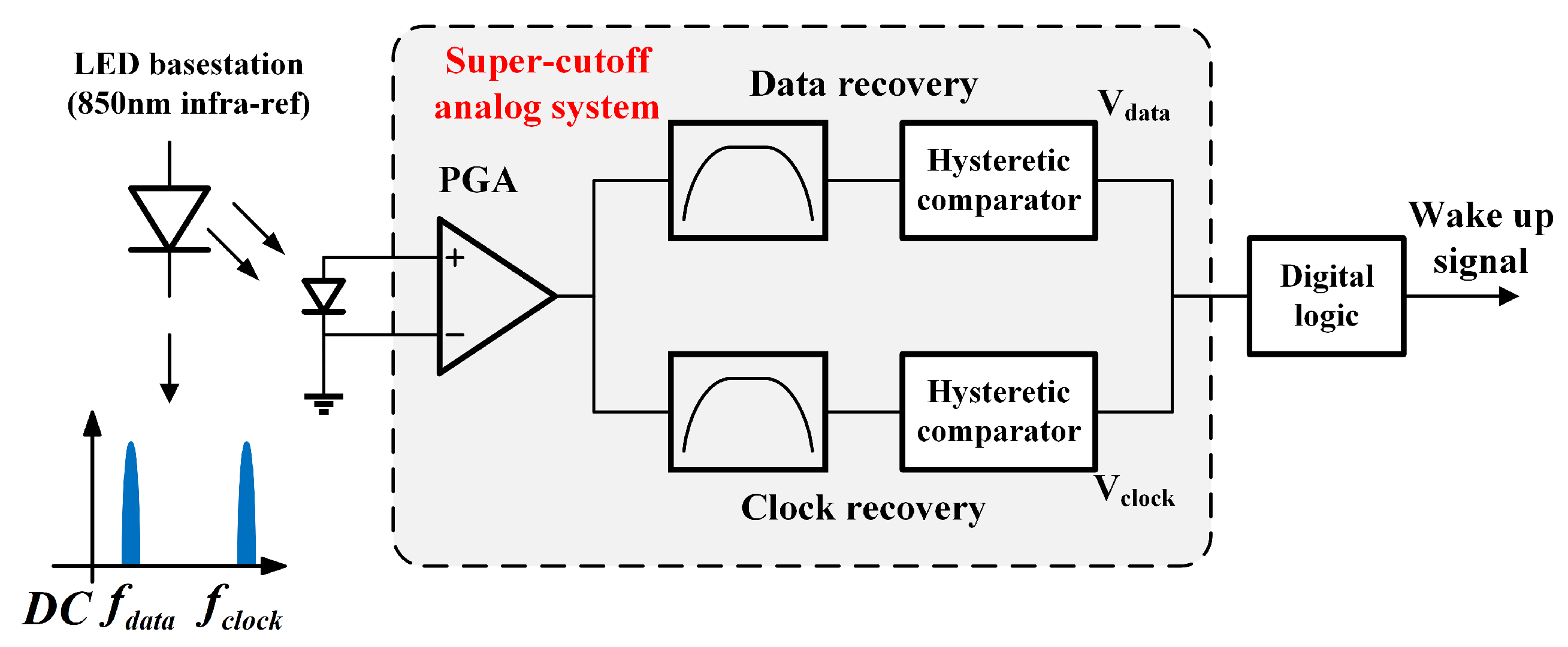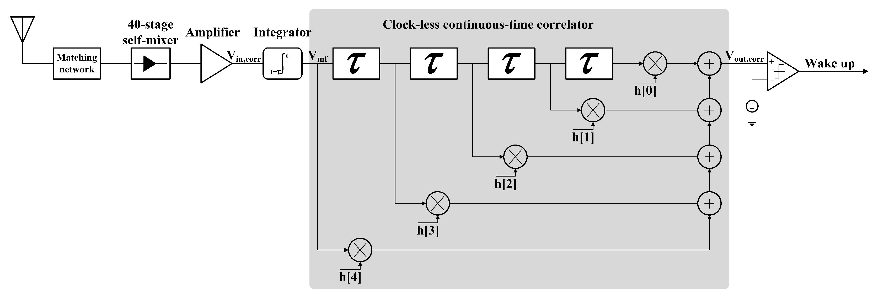 - Mangal, V.; Kinget, P.R. 28.1 A 0.42nW 434MHz −79.1dBm Wake-Up Receiver with a Time-Domain Integrator. In Proceedings of the 2019 IEEE International Solid- State Circuits Conference—(ISSCC), San Francisco, CA, USA, 17–21 February 2019; pp. 438–440. [Google Scholar] [CrossRef]
