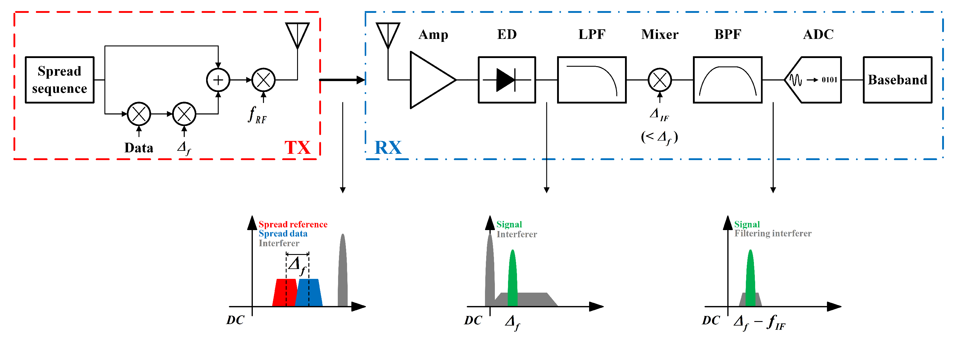 - Alghaihab, A.M.; Kim, H.S.; Wentzloff, D.D. Analysis of Circuit Noise and Non-Ideal Filtering Impact on Energy Detection Based Ultra-Low-Power Radios Performance. IEEE Trans. Circuits Syst. II Express Briefs 2018, 65, 1924–1928. [Google Scholar] [CrossRef]