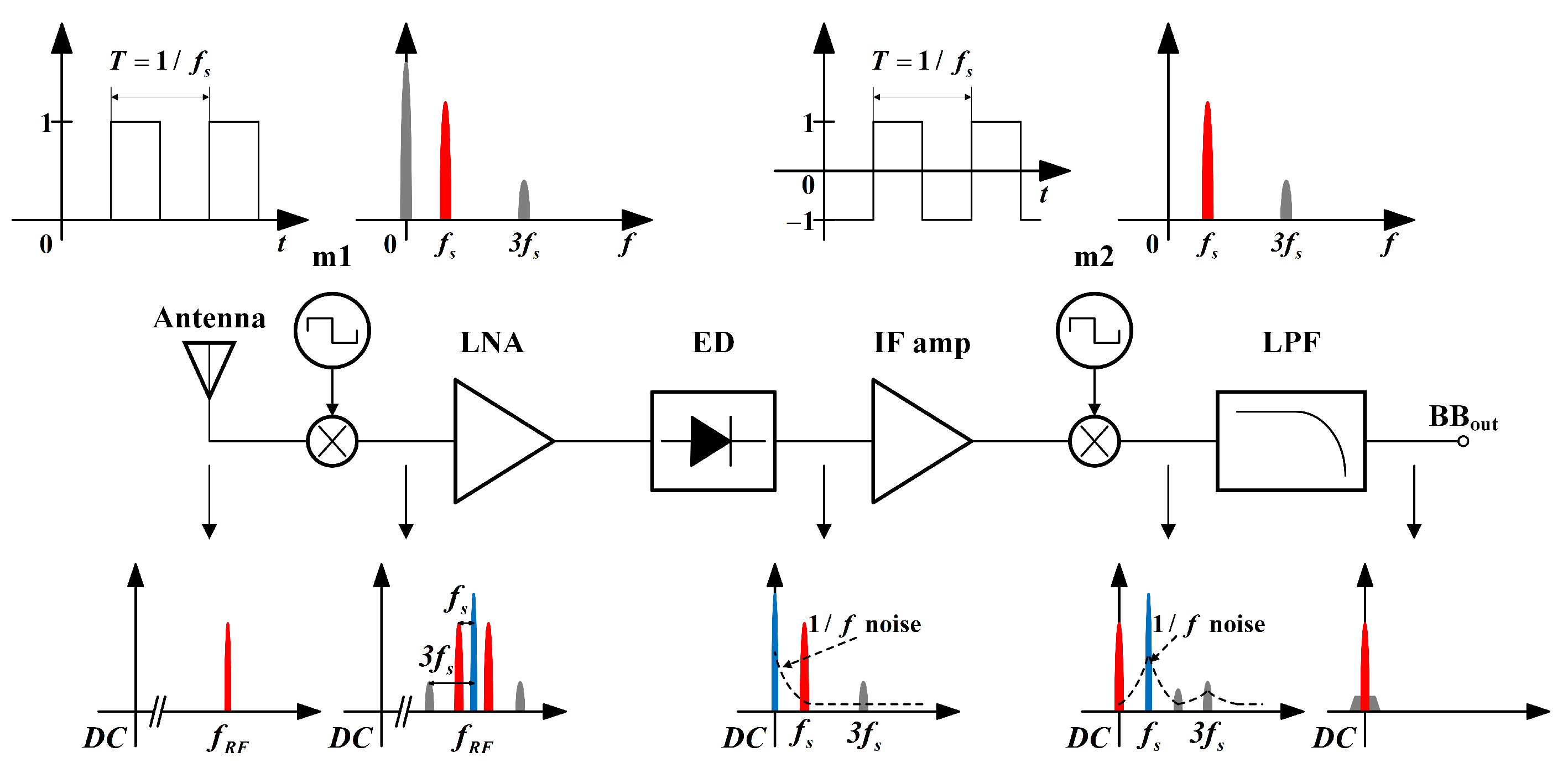 - Huang, X.; Dolmans, G.; De Groot, H.; Long, J.R. Noise and Sensitivity in RF Envelope Detection Receivers. IEEE Trans. Circuits Syst. II Express Briefs 2013, 60, 637–641. [Google Scholar] [CrossRef]