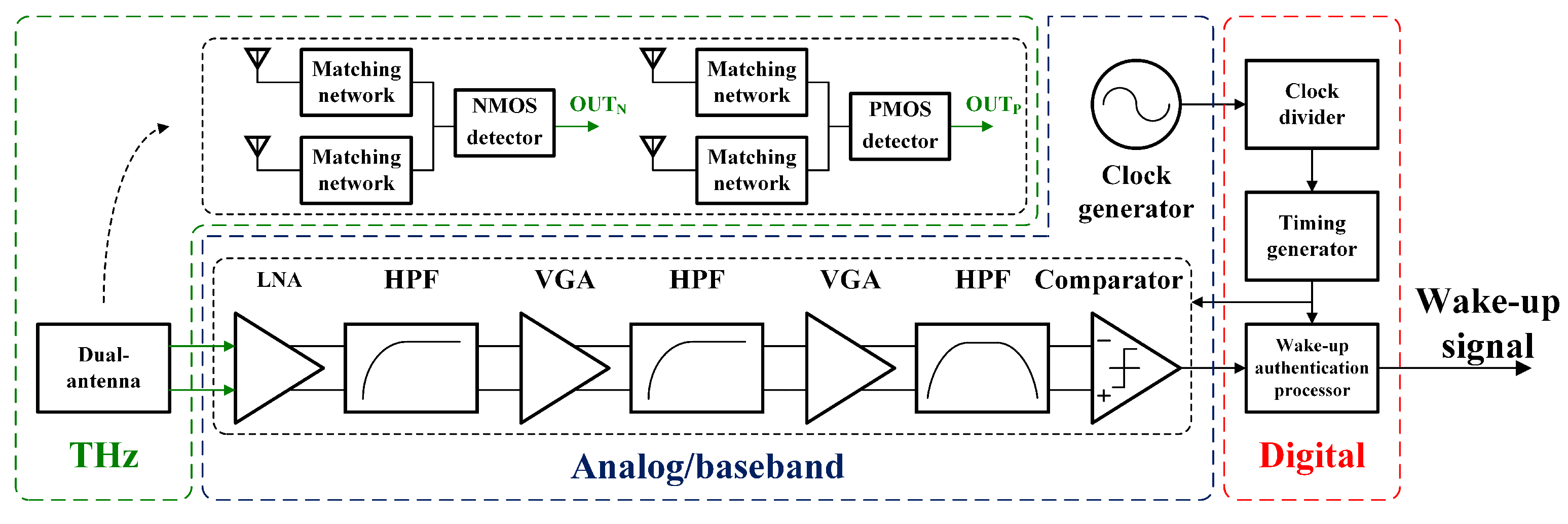 - Lee, E.; Khan, M.I.W.; Chen, X.; Banerjee, U.; Monroe, N.; Yazicigil, R.T.; Han, R.; Chandrakasan, A.P. A 1.54-mm2, 264-GHz Wake-Up Receiver with Integrated Cryptographic Authentication for Ultra-Miniaturized Platforms. IEEE J. Solid-State Circuits 2024, 59, 653–667. [Google Scholar] [CrossRef]