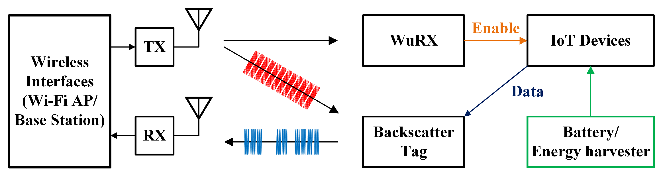 - Wang, P.H.P.; Zhang, C.; Yang, H.; Dunna, M.; Bharadia, D.; Mercier, P.P. A Low-Power Backscatter Modulation System Communicating Across Tens of Meters with Standards-Compliant Wi-Fi Transceivers. IEEE J. Solid-State Circuits 2020, 55, 2959–2969. [Google Scholar] [CrossRef]