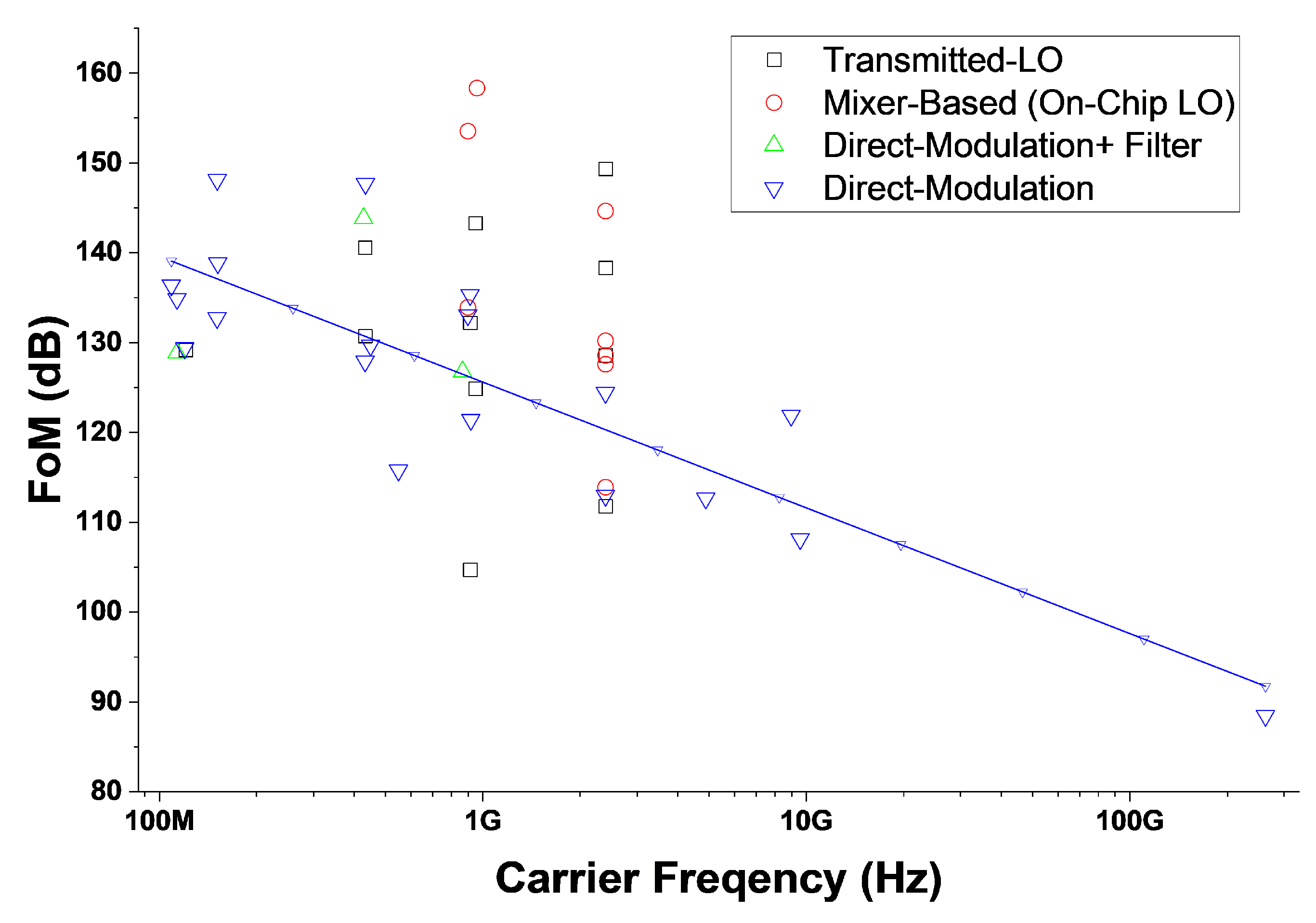 - RF envelope detection with filtering (e.g., MEMS): Adding a high-Q MEMS filter allows pre-ED filtering to be narrow enough that convolution (signal-noise mixing) noise dominates, making sensitivity scale with instead [28,32,46,55]. This architecture is applicable to the model described in (39) and (41).