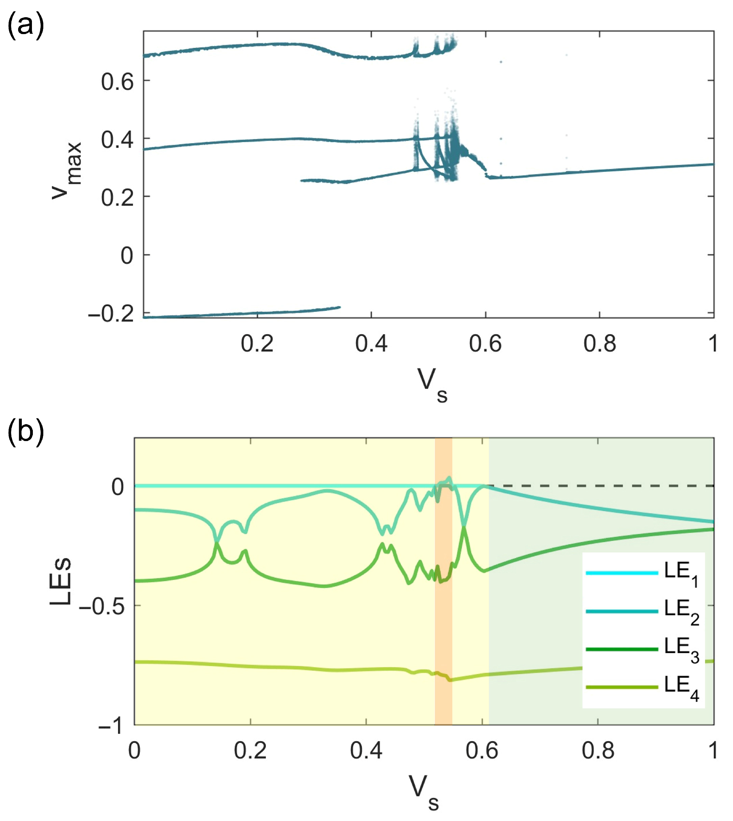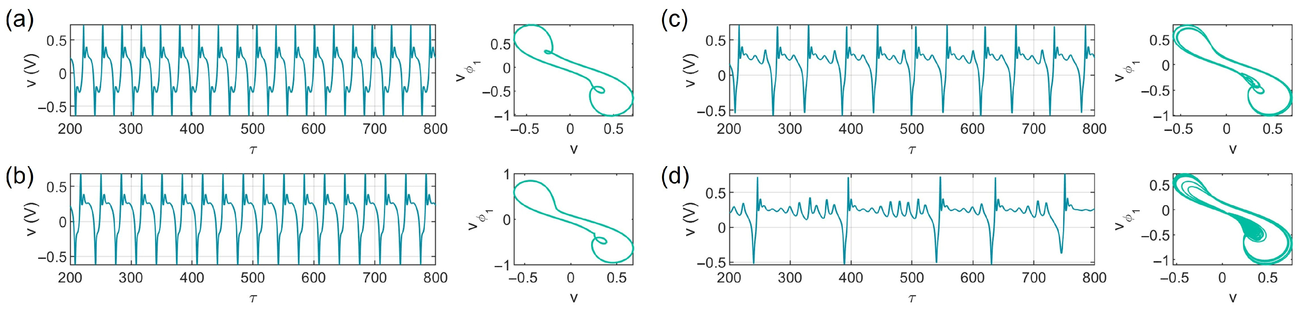 - Chen, L.; Bao, H.; Zhang, X.; Zhang, Y.; Bao, B. DC-bias induced chaotic dynamics and periodic bursting in Chua’s diode-based FitzHugh-Nagumo circuit. Chaos Solitons Fractals 2025, 199, 116739. [Google Scholar] [CrossRef]