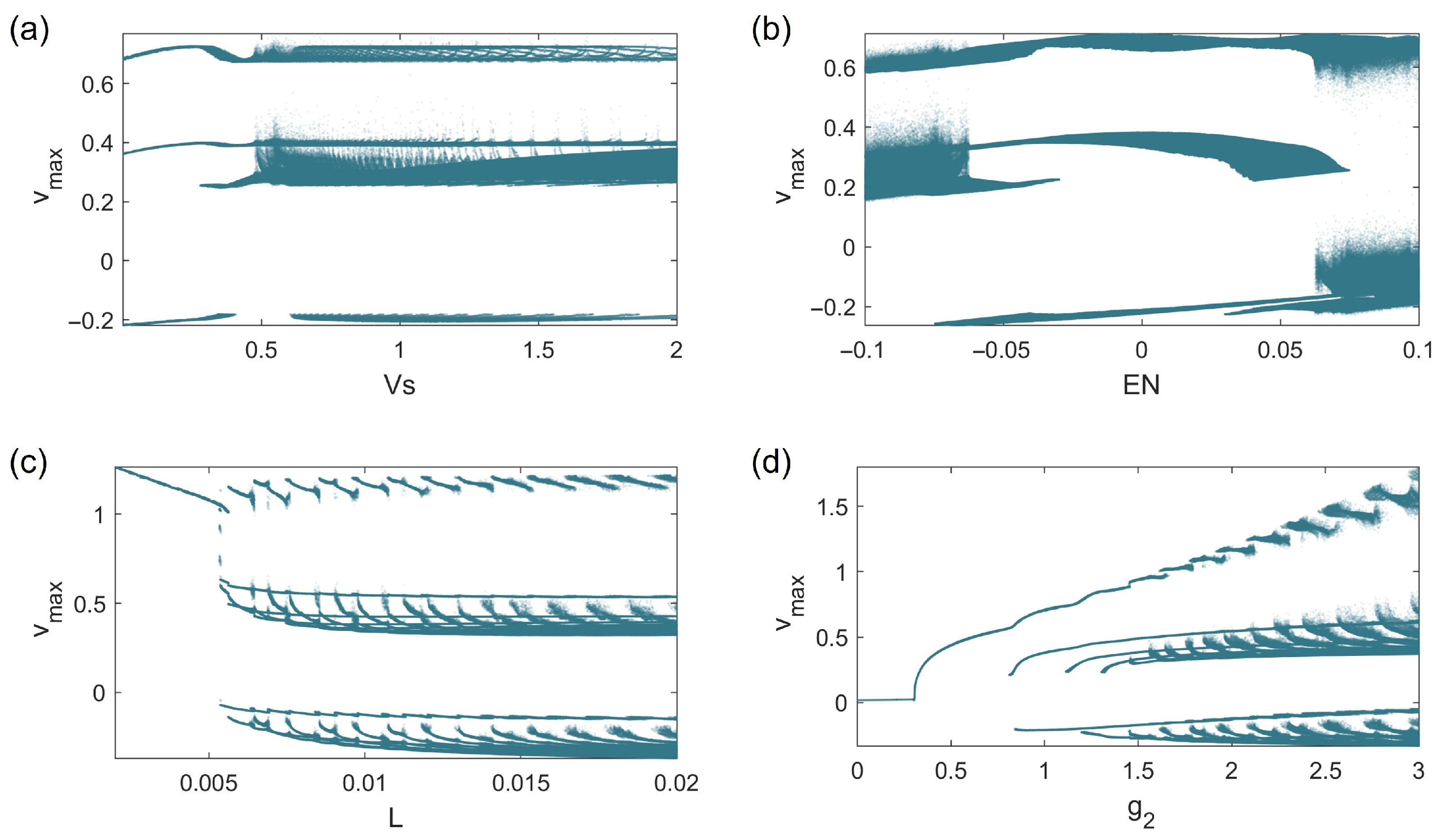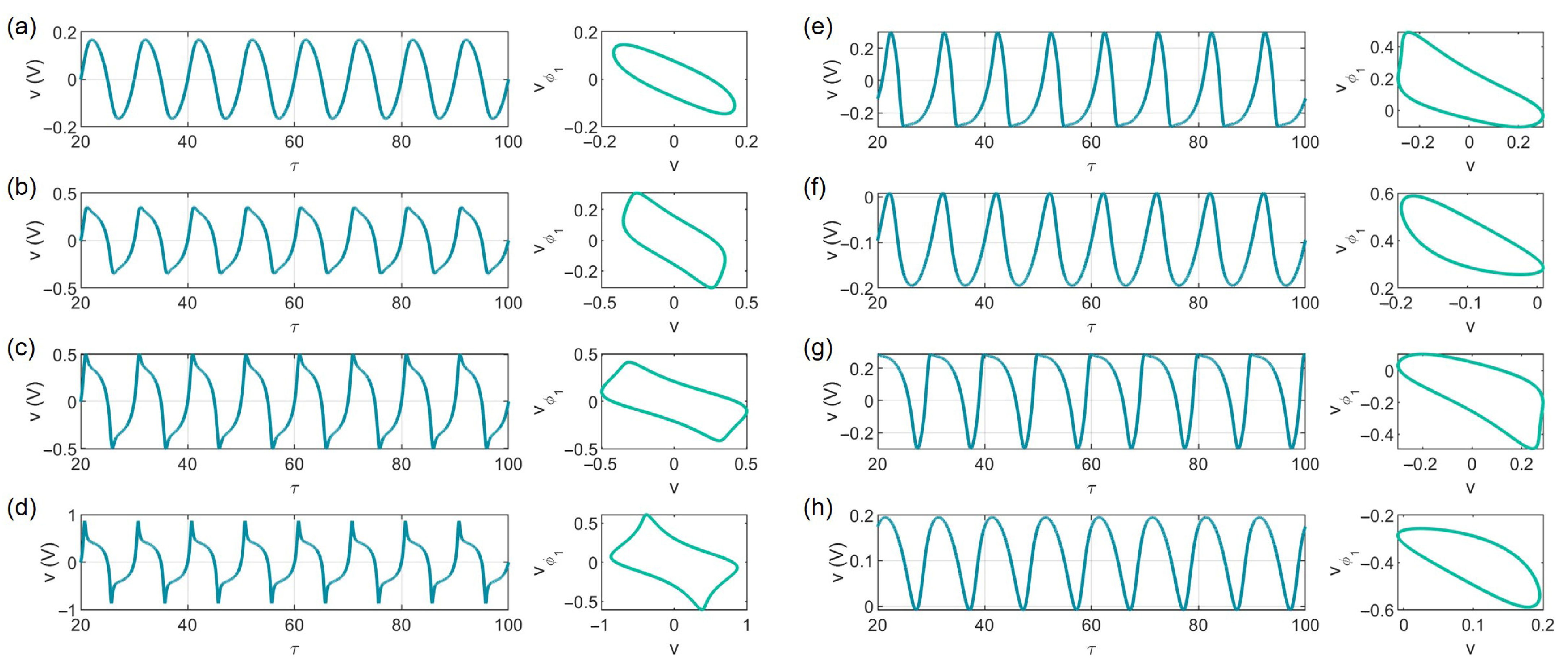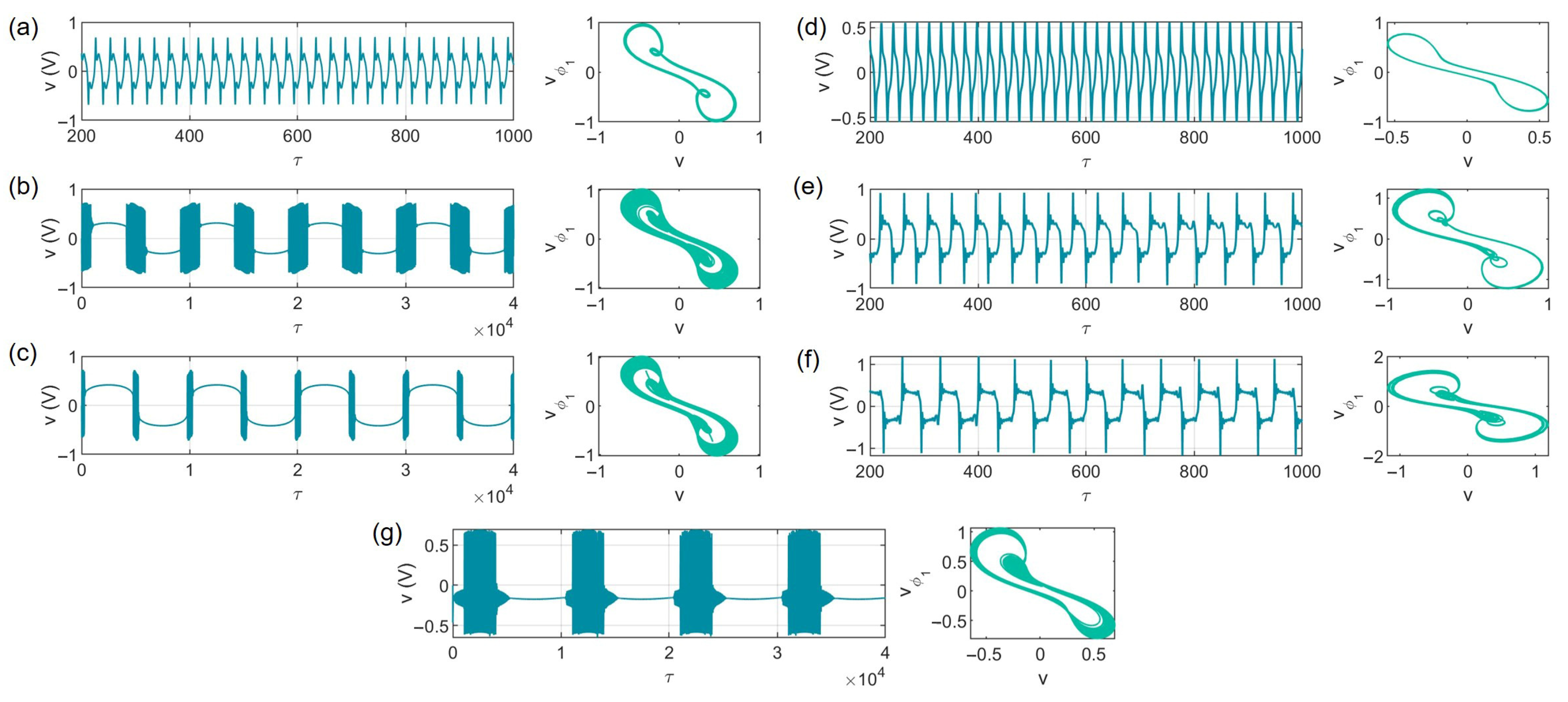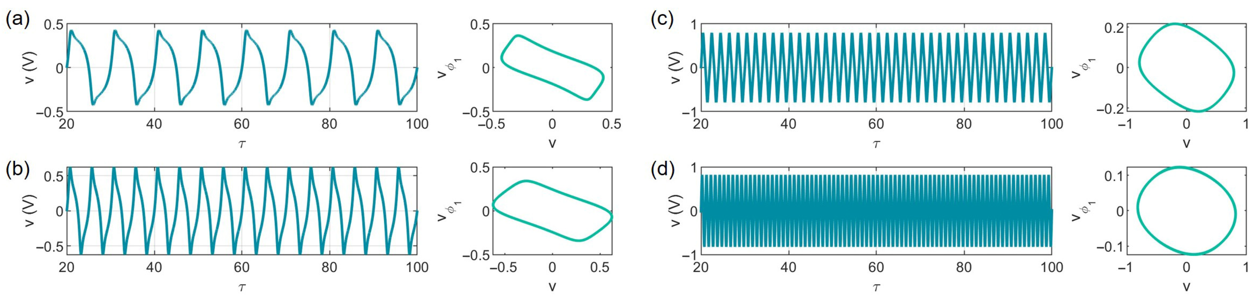 - Xu, Q.; Fang, Y.; Wu, H.; Bao, H.; Wang, N. Firing patterns and fast–slow dynamics in an N-type LAM-based FitzHugh–Nagumo circuit. Chaos Solitons Fractals 2024, 187, 115376. [Google Scholar] [CrossRef]