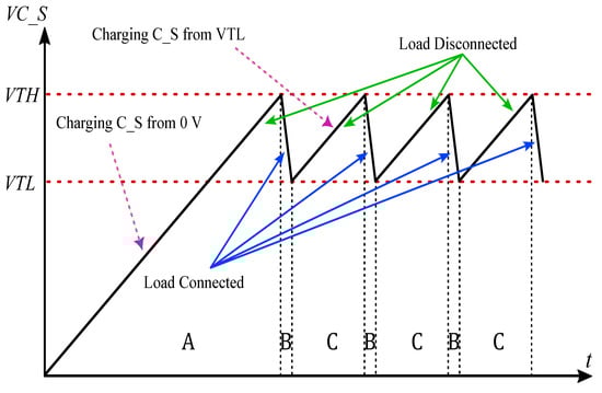 When VC_S reaches VTH, the output of the EM is enabled, connecting the load to the capacitor. At this point, the capacitor has sufficient energy stored to ensure stable operation, even during sudden discharges by the load. The load continues to function until VC_S drops to VTL, marking region B. At VTL, the EM disables the output and disconnects the load once again. After disconnection, the capacitor begins charging again to reach VTH. This second charging cycle, shown in region C, is faster because it starts from VTL rather than zero, unlike in region A.