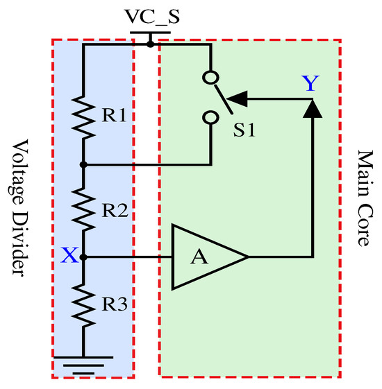 - Enabling: When VC_S becomes sufficiently high, the voltage at node X (VX) activates block A, and node Y is enabled. This action closes switch S1, causing resistor R1 to be shorted, which generates hysteresis. After connecting the load, this increase at VX preserves the existing state (region B). The value of VC_S just before the transition to the on state, while switch S1 is still open (region A), is defined as VTH. We have:
