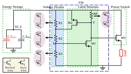 Recent research on EM architectures has focused on improving the efficiency and reliability of EH systems through more integrated and system-oriented designs. Several system-level approaches have also been introduced [10,14], integrating multiple control and regulation blocks to improve power stability in complex EH platforms. However, these implementations often rely on auxiliary subcircuits such as voltage references, comparators, or biasing networks, which increase quiescent current and occupy larger area [13,15]. In contrast, latch-based EM circuits [2,8,9] provide simpler structures with inherently low power consumption. Despite this advantage, most of the reported designs still depend on off-chip resistors or external bias components to obtain high resistance and hysteresis control, which constrains full on-chip integration and scalability.