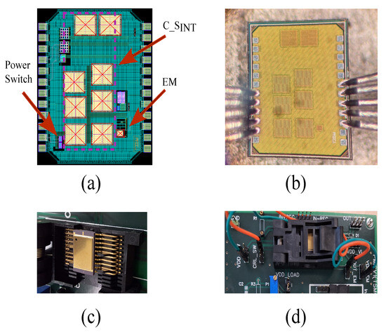 The layout of the proposed circuit is shown in Figure 4a, with a total area of 1.4 mm × 1 mm. In this layout, the EM, power switch, and capacitors are labeled and take approximately 1.2%, 0.13%, and 16.5% of the total die area, respectively. As illustrated, the EM and power switch occupy only a small portion of the die, while the large portion of the area is allocated to the internal storage capacitor, which has a capacitance of approximately 180 pF. To ensure robust operation and minimize leakage and thermal effects, the layout employs a combination of common-centroid placement for matched transistors, guard-ring isolation, and careful positioning of thermally sensitive elements. This layout strategy helps reduce mismatch caused by temperature gradients and parasitic coupling, while maintaining the stability of the EM circuit. The equivalent microphotograph of the fabricated die is presented in Figure 4b. In this image, only the capacitors and bonding pads are visible due to the presence of metal filling layers. To facilitate easier measurements on dies, SOIC-20 packaging was used for the fabricated dies, as shown in Figure 4c. The evaluation printed circuit board (PCB) used to test the proposed circuit is depicted in Figure 4d.