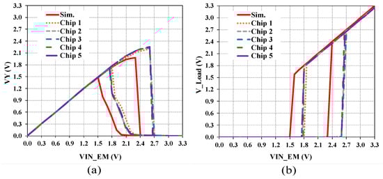In Figure 5a, the voltage at the output node of the EM core (VY) is measured. During the rising phase of VIN_EM, VY closely follows VIN_EM until it reaches the threshold voltage , after which it drops to 0 V to activate the PMOS power switch. Similarly, during the falling phase, from values above , VY remains at 0 V until VIN_EM reaches ; beyond this point, VY once again tracks VIN_EM, ensuring that the load remains disconnected in this configuration. In Figure 5b, the voltage available at the load, which corresponds to the drain terminal of the PMOS power switch, is shown. This voltage has an inverse relationship compared to VY. As shown in Figure 5, the five measured chips show almost identical behavior, except that chip 1 has a slightly higher . As VIN_EM begins to ascend, the measured and simulated values are approximately 2.75 V and 2.45 V, respectively. When VIN_EM descends, the measured and simulated values are around 1.75 V and 1.5 V, respectively.