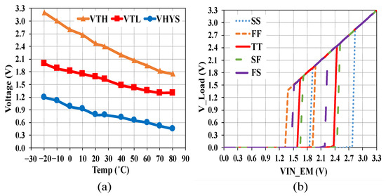 To evaluate different fabrication processes and testing conditions, simulation results at various temperatures and process corners are illustrated in Figure 6. From Figure 6a, it can be seen that the values of , , and hysteresis are higher at lower temperatures and decrease as the temperature rises. Moreover, Figure 6b shows that the threshold values increase toward slower process corners and decrease toward faster corners.