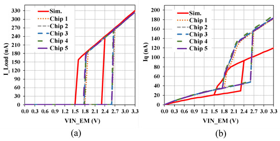 As mentioned earlier, the current consumption of an EM is one of the most critical specifications and is commonly referred to as quiescent current (Iq). To characterize this feature, the EM was tested without a connected load, and the supply current was measured directly. For a more accurate evaluation of the quiescent current of the EM, both rising and falling DC voltage sweeps were performed, as illustrated in Figure 7b. For example, at 3 V, the simulated quiescent current is 111 nA, while the measured value is 170 nA.