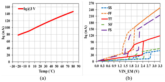 DC input voltage sweep of the EM when R_Load is open: (a) Iq of the EM at 3 V versus temperature. (b) Iq of the EM across different process corners.