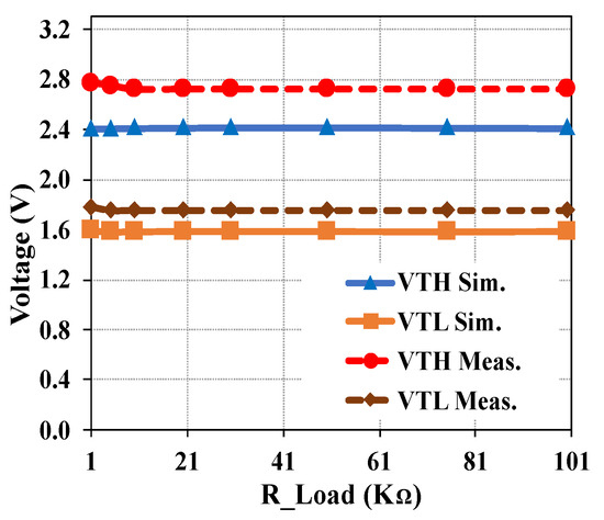 Figure 9 illustrates the effect of load resistance on the and values. The threshold levels remain nearly constant for load resistances ranging from 1 kΩ to 100 kΩ, indicating that the proposed circuit maintains stable performance across this range. This demonstrates the reliable operation of the EM with an internal power switch under varying load resistance conditions.
