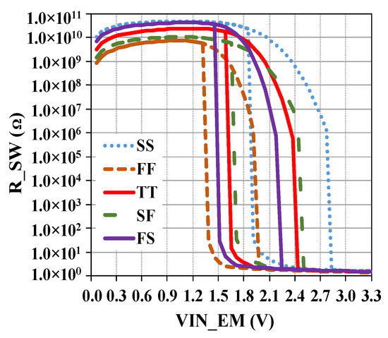 To gain a deeper understanding of the power switch operation, Figure 10 illustrates the resistance behavior of the switch. These simulation results were obtained across different process corners by performing a DC sweep of the supply voltage, using a 10 kΩ resistor as the load. During the rising phase of VIN_EM, the switch resistance remains high before reaching . As the supply voltage approaches level, the resistance gradually decreases but remains significantly higher than the load resistance, indicating that the switch can still be considered off. Once is reached, the switch resistance drops sharply to just a few ohms or less, allowing current to flow through the load. In the falling phase of VIN_EM, the switch stays fully on with low resistance until is reached. After this threshold, the switch turns off and the resistance becomes very high again.