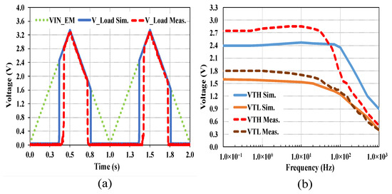 To provide a clearer understanding, the frequency of the triangular signal applied to the input of the EM was varied from 0.1 Hz to 1 kHz to evaluate the frequency-dependent behavior, as shown in Figure 11b. The value remains nearly constant up to 100 Hz in simulation and 30 Hz in measurement. Similarly, stays steady up to 20 Hz in simulation and 10 Hz in measurement. This behavior aligns well with the needs of EH applications, mainly due to the presence of a storage capacitor, which significantly reduces the voltage change rate. Although a considerable reduction in both threshold levels is observed at higher frequencies, a hysteresis voltage window still exists, ensuring correct switching behavior for energy storage based on Equation (1).