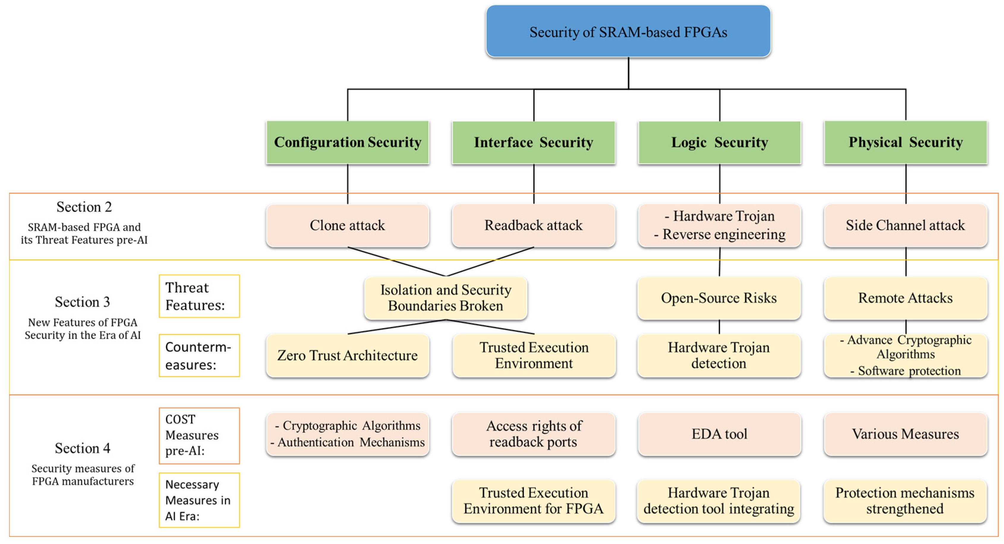 - Starting from the impacts of AI on aspects such as the architecture of FPGA chips, development methods, and application models, we comprehensively summarize the new characteristics of FPGA security in the AI era, including threat features and potential countermeasures.