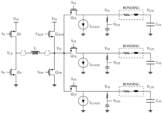 The off-chip inductor, L, is charged and then discharged over each operating period, by connecting the node, , to the input DC supply voltage or the ground node, respectively. This connection is performed by the two input switches, and . The inductor current is dynamically split among the three outputs by three switches, , and respectively. An off-chip capacitor is added in parallel on each output and acts as a charge tank when the output is not connected to the inductance with the goal to limit the voltage ripple.