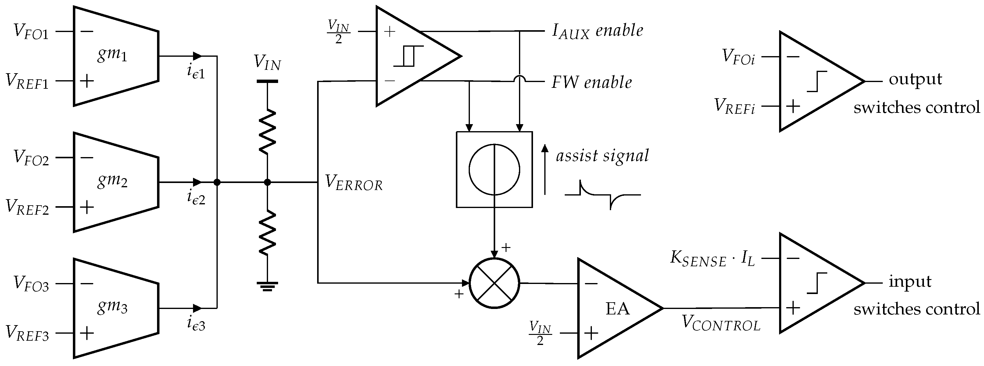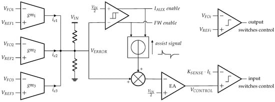 A current-mode control and a comparator-based hybrid control are proposed to operate the converter in Figure 2 as pictured in Figure 3. The first loop matches the average current flowing through the off-chip inductor to the sum of the instantaneous required output load currents. The second loop adjusts the duty cycle of the output switches, , to split optimally the inductor current into the three outputs. The first control loop is managed by a PWM peak-current mode control. The sensed output voltages , and are forwarded to transconductance cells , and , respectively. Depending on the difference between the actual output voltages and their nominal references, error currents are generated and summed into a resistor bridge to create the voltage, . A Proportional-Integral (PI) corrector is implemented to generate the voltage, . The latter voltage signal is compared to a sensed image of the inductor current to control the duty cycle of input switches. The current sensing is performed by a current copy circuit on the high-side switch, . The second control loop implements a comparator-based voltage control. When the off-chip inductor charge or discharge phase starts, the first output is supplied until it reaches its reference voltage. Then the second output is supplied, and finally the third one is supplied until the inductor charge or discharge phase ends and the cycle restarts. When the free-wheeling switch is enabled, the charge of the third output stops when its reference is reached and the remaining current is sent to the ground node until the end of the period. This comparator-based control has the advantage for reducing the cross-regulation phenomenon on the output switches, compared to traditional PWM-based control. When a transient occurs, the duty cycles of the output switches immediately adapt instead of being negatively impacted by the response delay of a PI controller. Loads transients are detected by a hysteretic comparator on the voltage, . The auxiliary current source and free-wheeling switch are enabled when reaches the hysteretic thresholds. Moreover, an assistance signal is added to the error amplifier input to speed up its response during a transient.