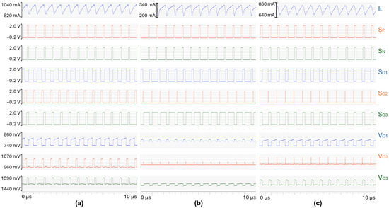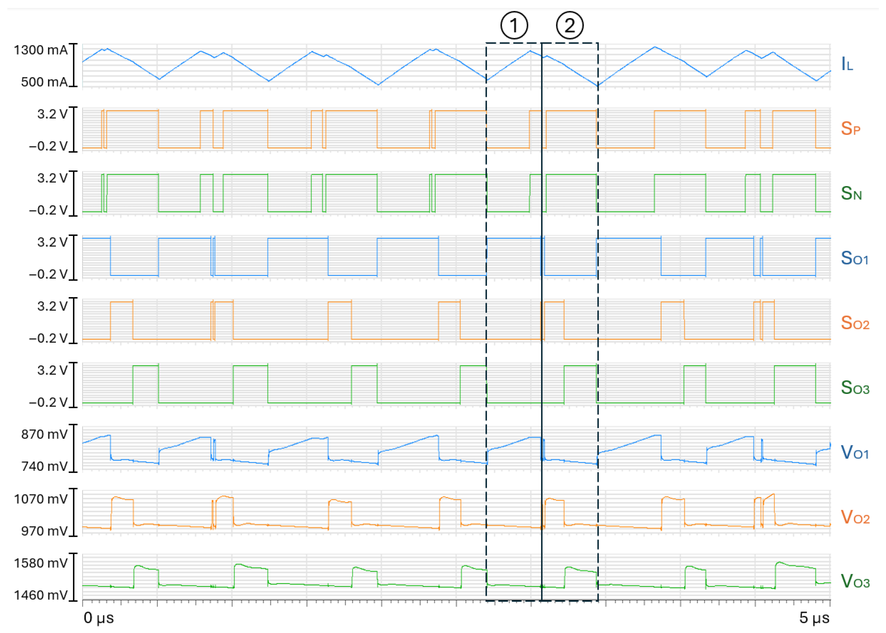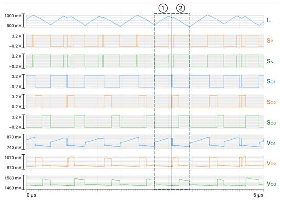 The SIMO DC-DC converter presented in the previous subsection is implemented in a ST-18nm-process. Figure 4 shows the main waveforms from the simulation of the transistor-level circuit model in a steady-state scenario under nominal supply voltage and maximum loads: is set to 3.0 V, equals 500 mA, and equal 200 mA. The switching frequency is 2.73 MHz, which corresponds to a period T = 366 ns.